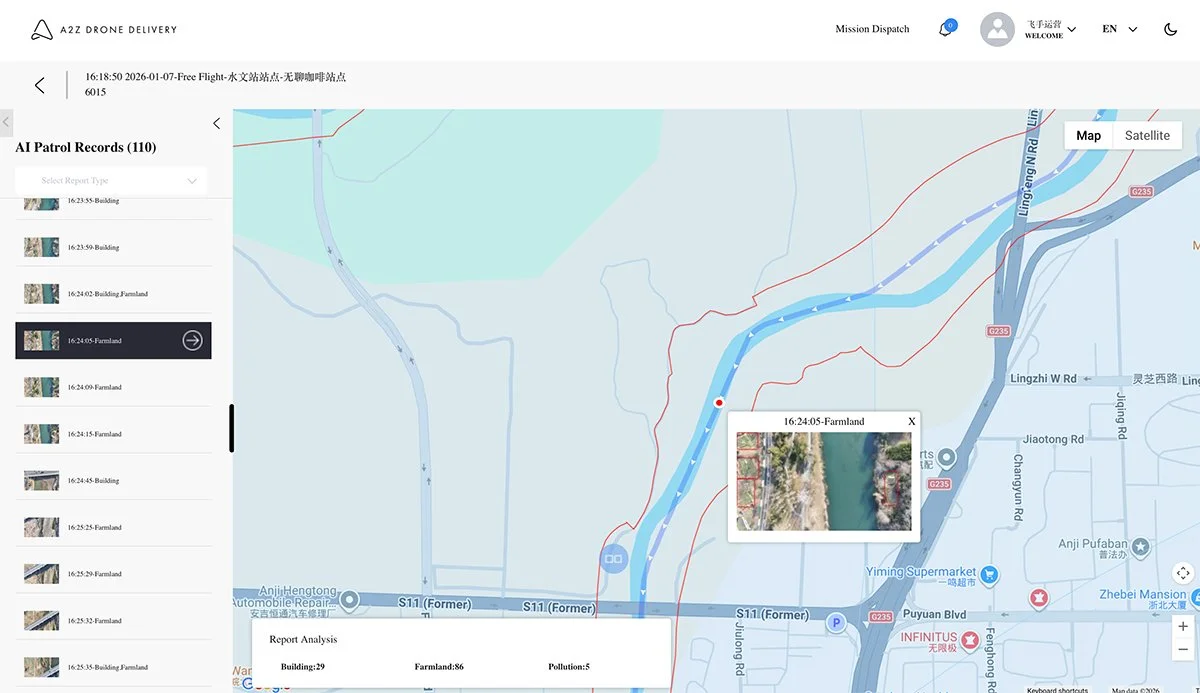 As the lead customer in the now-expanded project featuring 34 AirDocks, the Anji Bureau of Water Resources initially focused its drone operations on patrolling the county’s urban waterways, reservoirs, and tributaries. Monitoring had traditionally been conducted by department staff in ground vehicles and on foot. Routine inspection of the waterways weaving through the urban terrain was labor-intensive, often taking several days, and some hard-to-reach areas were rarely visually inspected at all. With the addition of the network of A2Z AirDocks, and companion Longtail Patrol aircraft, the department was able to trim the inspection time for this section of its system to just 1.5 hours. After proving the efficiency of the Longtail’s repeatable autonomous patrol capabilities supported by the automatic-charging capability of the AirDocks, the department sought to expand the reach of the dock network to further improve its waterway monitoring mission.