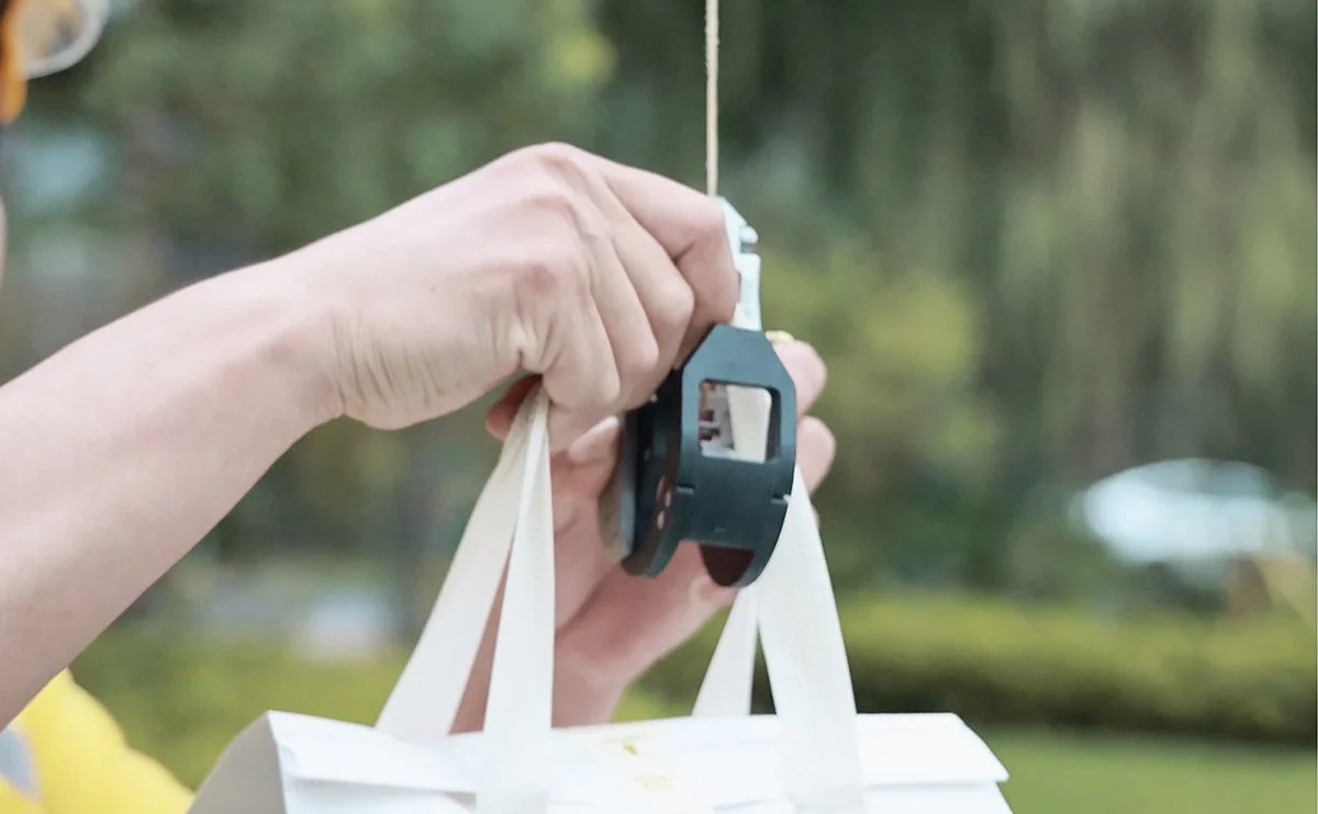 Hotel guests throughout the region are able to place a food order through a Yelp-like app. Once orders are prepared by the restaurant staff, they are brought to the closest AirDock where a delivery drone awaits. When the Longtail lands on the elevated AirDock, it lowers its integrated A2Z commercial drone winch to the waiting restaurant staffer who loads the food onto the patented delivery hook. Eliminating the need for a trained hub operator to handle loading and unloading simplifies the process and makes deliveries more cost-effective for customers. At its final destination miles away, the Longtail Cargo safely delivers orders from altitude, automatically releasing the payload as it is lowered from the winch at the hotel or resort.